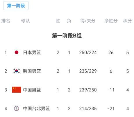B组三轮事后,日本队、韩国队齐是2胜1负,齐在本轮遭逢首场败仗,中国队、中国台北队齐是1胜2负,齐在本轮赢得首场顺利,最新积分榜如下: