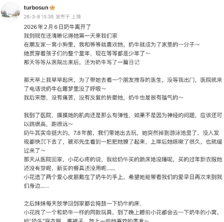 3月8日,演员孙俪在应付平台发文,字里行间尽是抽搭与不舍,一则“爱犬‘奶牛’一个月前离世”的音尘,一霎戳中大王人网友的泪点,蓝本以为仅仅一场凡俗的宠物离世共享,却因她回忆的过往碎屑、儿女的暖心举动,激发全网共情,也让一场对于“追随与想念”的盘问,悄然膨大。